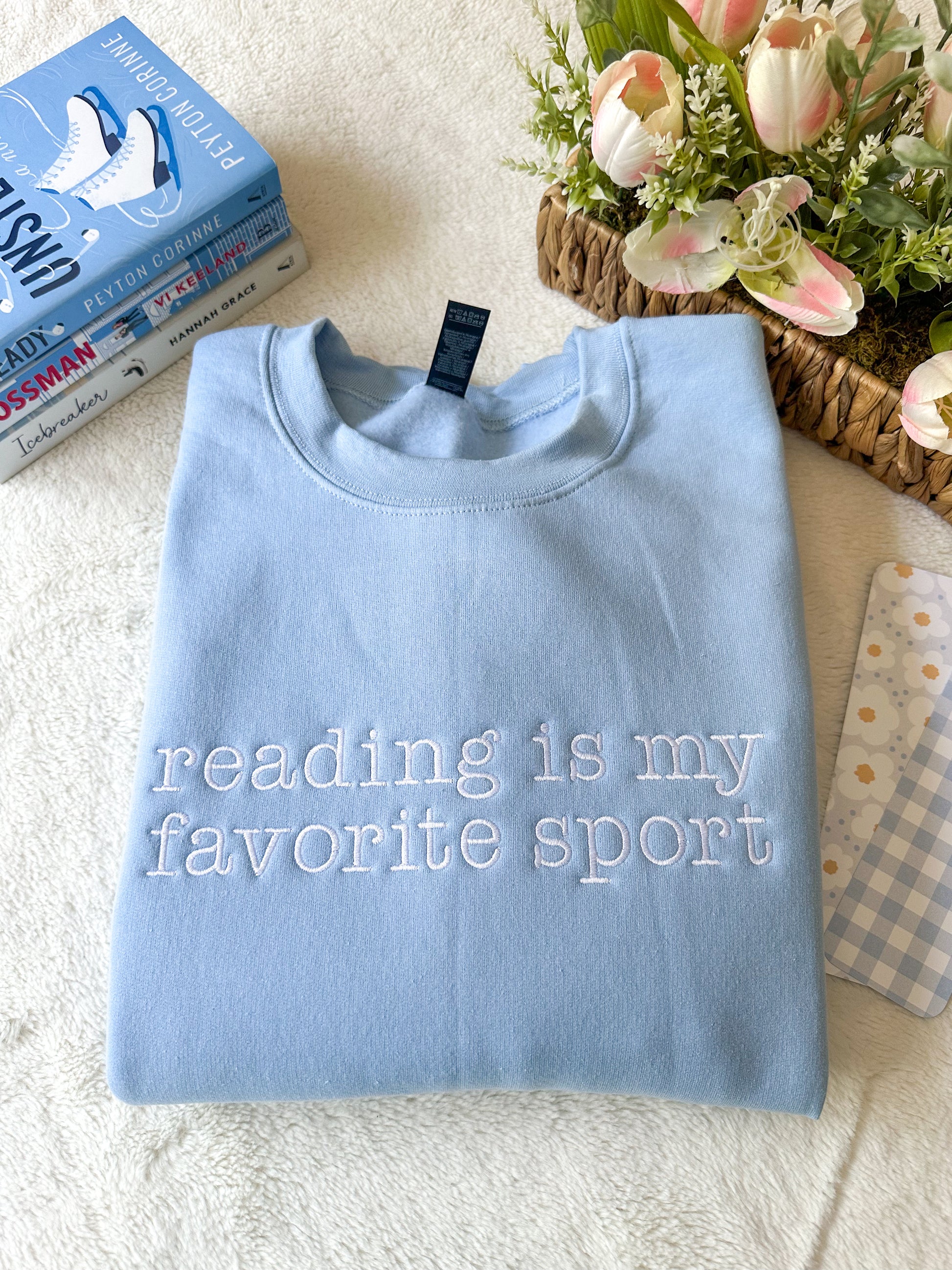 Our “Reading Is My Favorite Sport” embroidered sweatshirt is made for book lovers, cozy readers, librarians, teachers, and anyone who prefers a good book over a gym session.
